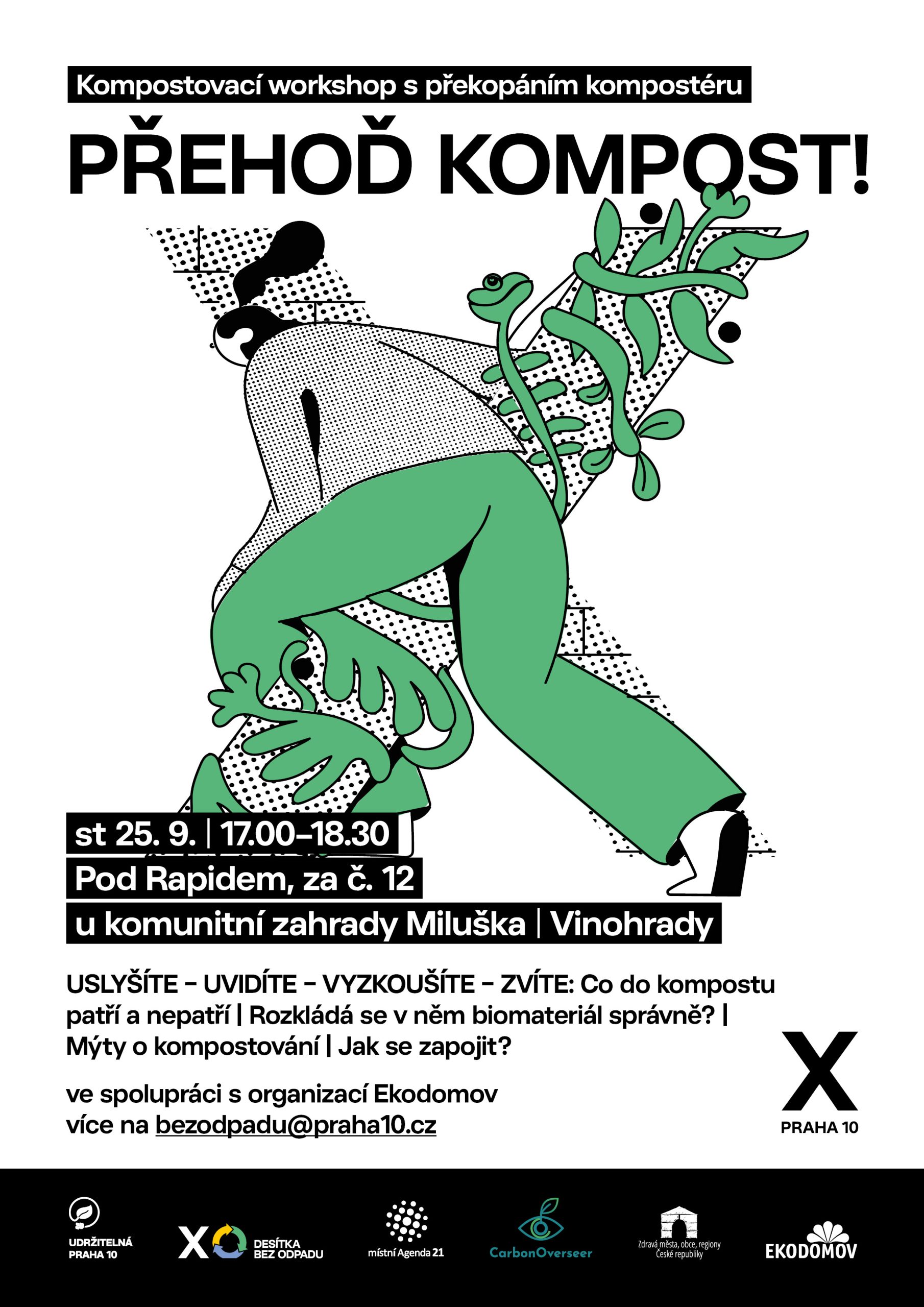Na přelomu září a října 2024 připravila Praha 10 ve spolupráci s organizací Ekodomov pro veřejnost dvě setkání – workshopy u komunitních kompostérů v ulicích Vilová a Jahodová. Účastníci získali mnoho informací, které se vážou ke kompostování včetně zajištění optimálního postupu celého procesu, možnosti využití kompostu pro zvýšení úrodnosti půdy či správné skladby vkládaného materiálu, a součástí byla i obhlídka vnitřku kompostérů s překopáním/přehozením kompostovaného materiálu.