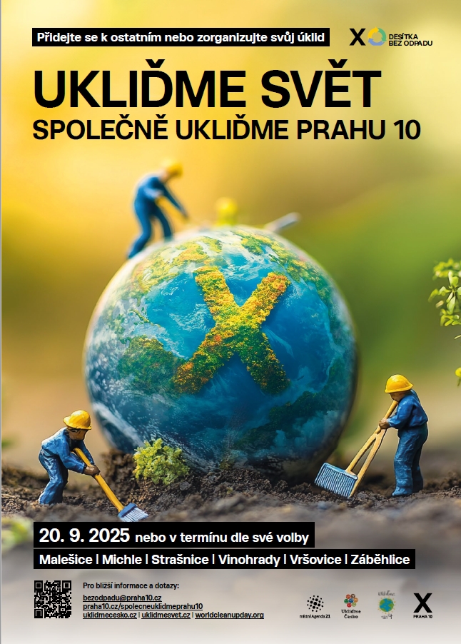 Ukliďme svět – zapojte se na Desítce: Celosvětový úklidový den bude v sobotu 20. září 2025, úklidy probíhají ale i během celého roku, a na Desítce se uskutečňují i v rámci dlouhodobé radniční aktivity Společně ukliďme Prahu 10. Každý, kdo má zájem se zapojit do čištění Prahy 10 od pohozených odpadků se může obrátit na radnici s žádostí o součinnost ve formě poskytnutí úklidových pomůcek, odvozu nashromážděného odpadu nebo třeba vytipování vhodného místa pro úklid. Domluva je možná využitím emailového kontaktu bezodpadu@praha10.cz . Bližší informace k úklidové akci lze najít na webové stránce www.uklidmecesko.cz a www.uklidmesvet.cz. Děkujeme za Váš zájem.